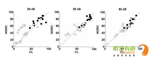 如下圖,白點是重度聽力損失患者的輔音識別得分,黑點是輕度至中度聽損患者的輔音識別得分;每位受試者佩戴四通道的耳背機,驗配采用 NAL 公式;測試言語聲強度分別為 50dB SPL、65dB SPL 和 80dB SPL;比較 WDRC 和線性輸出壓縮限制(CL)兩種線路的得分。