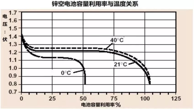 如下圖所示,在0°環境下,電池容量的利用率降低一半,也就是平時能用10天的助聽器,現在只能用5天。高溫對助聽器電池容量利用率的影響不大。