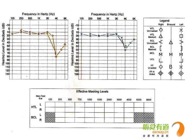 <span style="font-size:16px;"> 首先聽覺有道跟大家解釋一下純音測聽的定義以及臨床意義。純音測聽包括氣導聽閾測試(AC)和骨導聽閾測試(BC),以耳機及骨導振子給聲,反應受試者在安靜環境下能夠聽到的各個頻率的最小聲音的聽力級(氣導頻率范圍125-8000Hz,骨導250-4000Hz)。它是目前能準確反映聽敏度的主觀行為測試方法之一,在臨床上是最基本最重要的聽力檢查方法。</span></p><p><span style="font-size:16px;"><br /></span></p><p style="text-align: center;"><span style="font-size:16px;"><img src="/upfiles/201803010200415958.jpg" align="middle" alt="" /><br /></span></p><p style="text-align: center;"><span style="font-size:16px;"><br /></span></p><p><span style="font-size:16px;"> 先整體看一下聽力圖,它的橫坐標是純音的頻率,縱坐標表示的是聽力級(單位為db HL),從上往下看數字是變大的。0表示聽力零級,簡單地說就是科研人員測了很多聽力正常男女的聽力,以他們能聽到的最小聲音作為聽力零級。所以如果你的聽力是正常的話,聽力圖上的閾值曲線應該在零附近浮動,如果你聽力超常,那就在0以上也就是為負值了。如果你聽力下降,那線就往下走,越往下就說明聽力損失得越多。從生活常識上理解,所謂聽閾聽閾,閾值越低表示你能聽到越小的聲音,聽力就越好,閾值越高,聽力越差。</span></p><p><span style="font-size:16px;"> 接著說一下聽力圖上的圈圈叉叉代表的意思。叉叉表示左耳的氣導聽閾,圈圈表示右耳氣導,開口向左的尖括號表示左耳骨導,開口向右的表示右耳骨導。旁邊的masked表示加掩蔽之后的聽力。</span></p><p><span style="font-size:16px;"> 為什么要加掩蔽呢?舉個例子:你右耳聽力比左耳好,當你左耳給聲強度很大,會出現你左耳其實沒聽見但右耳偷聽到了的情況,這時你就會反應,但是這時你的反應能代表左耳的聽閾嗎?肯定比你實際聽閾要好,所以測聽人員會在你右耳加噪聲,不讓你右耳偷聽左耳的聲音,這樣測出來的左耳聽力稱掩蔽之后的聽閾。左耳掩蔽之后的氣導用小正方形來表示。同理,右耳掩蔽用小三角形表示。骨導也需要掩蔽。左耳掩蔽后骨導用向左的方括號表示,右耳用向右的方括號表示。</span></p><p><span style="font-size:16px;"> 最后我們該如何分析聽力圖。簡單地說,氣導的傳聲路徑包括外中內耳以及神經部分,骨導只包括內耳和神經部分,因此出現骨氣導差則表明聽覺通路上有外中耳病變。考慮到各種誤差因素,一般認為骨氣導相差10db HL屬于正常范圍。根據骨氣導的關系可以將聽力損失分為傳導性聽力損失、感音神經性聽力損失以及混合性聽力損失。骨氣導差大于10,且骨導在正常范圍為傳導性聽損;骨氣導一致且都在正常范圍以外為感音神經性聽損;骨氣導差大于10,骨導在正常范圍之外為混合性聽損。</span></p><p><span style="font-size:16px;"> 當然,如果想進一步定位聽力診斷結果,還需要結合其他的一些測試如聲導抗、ABR、耳蝸電圖、耳聲發射、40Hz、影像學檢查等。</span></p><p><span style="font-size:16px;"> 更多詳情請登錄m.zjqianhao.com。</span></p>" />