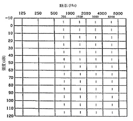 純音測試聽力圖的橫坐標為頻率,從左至右表示測試聲的頻率從低到高,即125Hz至8000Hz;縱坐標為強度,從上至下表示受試者能聽到的最小的聲音強度,以dBHL為單位。如下圖所示: