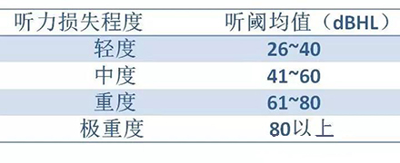 按照世界衛生組織(WHO)1997年的標準,根據0.5kHz、1kHz、2kHz、和4kHz氣導平均聽閾值,將聽力損失分為輕度、中度、重度和極重度。