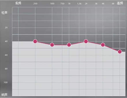 以下圖平坦型聽力曲線為例,當周圍言語聲高于其聽閾,即處于曲線下方區域時,該聽力損失者能聽到;當周圍言語聲低于其聽閾,即處于曲線上方區域時,聽力損失者則聽不到對方的說話聲。此為“時而聽得到,時而聽不到”。