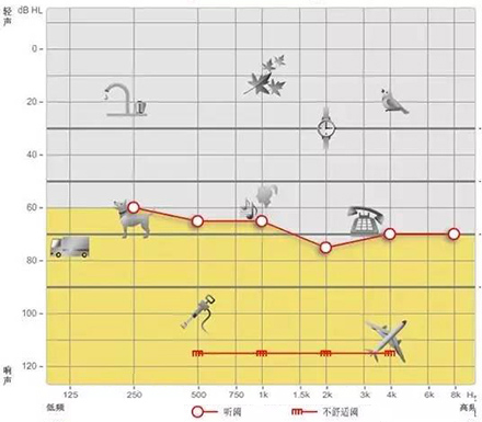 小聲聽不到,大聲受不了是重振現象。以下圖聽力曲線為例,“飛機”處于不舒適閾附近,聽力損失者對“飛機”的聲音聽著受不了。另外,該聽力損失者聽不到“手表”等聲音。