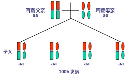 聽(tīng)力正常有時(shí)只是“表象”,如果骨子里“隱藏”著聽(tīng)損致病基因,這代“躲”過(guò)了聽(tīng)力損失,可是下一代、下下一代呢?</p><p> 生活中我們會(huì)發(fā)現(xiàn),有一些父母雙方都有正常的聽(tīng)力,但生出的孩子卻患有遺傳性聽(tīng)力損失,很多人都會(huì)感到詫異,甚至父母本身都無(wú)法相信自己竟然生出了弱聽(tīng)的孩子。</p><p> 其實(shí),此類“怪異事情”的發(fā)生離不開(kāi)基因的作用,這與遺傳性聽(tīng)損中的常染色體隱性遺傳密切相關(guān)。</p><p> 今天就帶大家看看:常染色體隱性遺傳性聽(tīng)損是怎么一回事?它有什么特點(diǎn)呢?基因又是如何“從中作祟”的呢?</p><p> 先來(lái)說(shuō)說(shuō)隱性遺傳為什么“隱藏”在骨子里</p><p> 俗話說(shuō),龍生龍,鳳生鳳,老鼠的兒子會(huì)打洞。這些表現(xiàn)都是基因所賦予的、與生俱來(lái)的,我們稱這種表現(xiàn)是顯性的。但有時(shí),即便你骨子里帶著那份基因,可是沒(méi)有表現(xiàn)出來(lái)。</p><p> 例如上文說(shuō)到的,父母雙方聽(tīng)力正常,但其實(shí)他們?nèi)杂新?tīng)損致病基因,這種表現(xiàn)就叫隱性。</p><p> </p><center><img alt="" src="/upfiles/201904260337585875.png" width="440" height="250" /></center><p></p><p> 接著說(shuō)說(shuō)常染色體隱性遺傳性聽(tīng)損“隱藏”的聽(tīng)力損失</p><p> 常染色體隱性遺傳性聽(tīng)損是指與聽(tīng)力損失表型相關(guān)的基因位于常染色體上,是最常見(jiàn)的遺傳性聽(tīng)損,約占80%。 一般而言,這類聽(tīng)力損失多指非綜合征型聽(tīng)損,即聽(tīng)力下降是其唯一臨床表現(xiàn),大多數(shù)患者癥狀早發(fā)且程度較重。</p><p> 這類聽(tīng)力損失只有在來(lái)自父母的等位基因均攜帶致病突變時(shí)才出現(xiàn)聽(tīng)力下降。</p><p> </p><center><img alt="" src="/upfiles/201904260338048765.png" width="440" height="250" /></center><p></p><p> 根據(jù)人類基因組命名委員會(huì)的規(guī)則,以DFNB來(lái)表示常染色體隱性遺傳性聽(tīng)損。</p><p> 第一個(gè)致病基因座位表述為DFNB1,此后依據(jù)基因座發(fā)現(xiàn)及獲得命名的時(shí)間順序,依次命名為DFNB2,DFNB3……</p><p> 目前,常染色體隱性遺傳的基因座位一共有86個(gè)。其中DFNB1和DFNB18中各有兩個(gè)聽(tīng)損致病基因,其他為各一個(gè)聽(tīng)損致病基因。</p><p> 例如,GJB2基因是中國(guó)人最常見(jiàn)的聽(tīng)損致病基因,在兒童非綜合征聽(tīng)損中占40%,其基因座位為DFNB1。</p><p> </p><center><img alt="" src="/upfiles/201904260338091241.png" width="440" height="250" /></center><p></p><p> 聽(tīng)損隱性遺傳表現(xiàn)各式各樣不是想“躲”就能“躲”</p><p> 涉及到不同聽(tīng)損致病基因的共同作用,常染色體隱性遺傳方式有很多,下面就以最常見(jiàn)且最簡(jiǎn)單的方式進(jìn)行舉例分析:</p><p> 1. 父母雙方聽(tīng)力正常,都為聽(tīng)損致病等位基因的攜帶者(Aa),則子女中有25%的概率患有聽(tīng)力損失,50%的概率為聽(tīng)損致病基因攜帶者。</p><p> </p><center><img alt="" src="/upfiles/201904260338147337.png" width="440" height="250" /></center><p></p><p> 2. 父母雙方都患有聽(tīng)力損失,且聽(tīng)損致病基因?yàn)榈任换?aa),則子女基因都為(aa),100%患有聽(tīng)力損失,也就是代代相傳。</p><p> </p><center><img alt="" src="/upfiles/20190426033818859.png" width="440" height="250" /></center><p></p><p> 3. 父母一方為聽(tīng)力正常者(AA),另一方患有聽(tīng)力損失(aa),則子女基因都為(Aa),即聽(tīng)力正常的聽(tīng)損致病基因攜帶者。</p><p> </p><center><img alt="" src="/upfiles/201904260338249987.png" width="440" height="250" /></center><p></p><p> 4. 父母一方為聽(tīng)力正常的聽(tīng)損致病基因攜帶者(Aa),另一方患有聽(tīng)力損失(aa),則子女基因50%的概率為聽(tīng)力正常但攜帶聽(tīng)損致病基因(Aa),50%的概率患有聽(tīng)力損失(aa)。</p><p> </p><center><img alt="" src="/upfiles/201904260338297827.png" width="440" height="250" /></center><p></p><p> 5. 父母雙方都有聽(tīng)力損失,但非等位基因,父親為(aaBB),母親為(AAbb),則子女基因都為AaBb,即100%的概率聽(tīng)力正常。</p><p> </p><center><img alt="" src="/upfiles/201904260338427827.png" width="440" height="250" /></center><p></p><p> 常染色體隱性聽(tīng)損遺傳的特征下一代“躲”得過(guò)嗎?根據(jù)如上分析,我們可以總結(jié)常染色體隱性遺傳性聽(tīng)損具有以下特征:</p><p> 1. 聽(tīng)損致病基因位于常染色體,因而聽(tīng)損致病基因的遺傳與性別無(wú)關(guān),即男、女性的患病機(jī)會(huì)均等;</p><p> 2. 系譜中通常看不到連續(xù)傳遞現(xiàn)象,往往是散發(fā)病例,但同胞中可有多人患病;</p><p> 3. 患者的雙親一般不患病,但都是致病基因的攜帶者;</p><p> 4. 患者的同胞有1/4的風(fēng)險(xiǎn)患病,患者表型正常的同胞中有2/3的概率為攜帶者;</p><p> 5. 患者的后代一般不發(fā)病,但一定是聽(tīng)損致病基因攜帶者;</p><p> 6. 近親婚配時(shí),子女的發(fā)病風(fēng)險(xiǎn)顯著提高,因?yàn)楣餐淖嫦瓤赡軅鬟f給他們共同的突變基因。</p><p> </p><center><img alt="" src="/upfiles/201904260338494272.png" width="440" height="250" /></center><p></p><p> 可見(jiàn),遺傳性聽(tīng)損有多種多樣的表現(xiàn)形式,需要細(xì)分遺傳模式。 父母的不同表型和不同聽(tīng)損致病基因決定了其后代各種各樣的表現(xiàn)形式。<