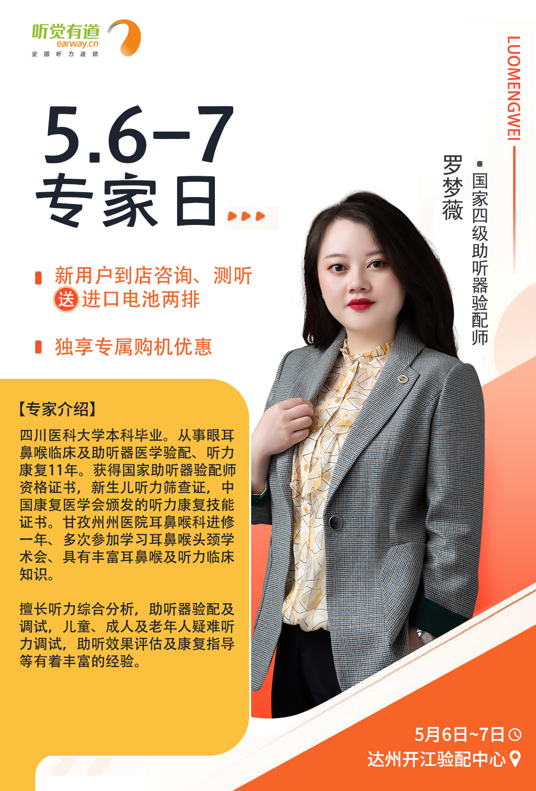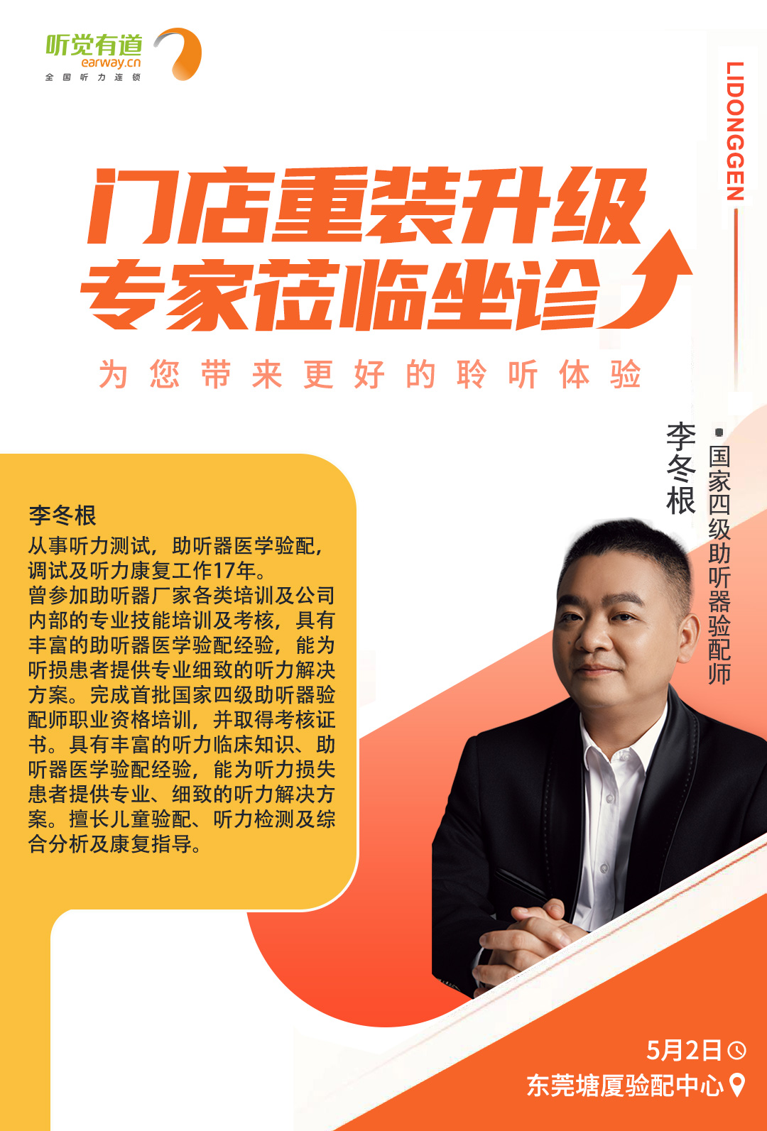 <span style="white-space:pre"> </span>為了更好地服務聽損人士,帶來高質量的聆聽感受,聽覺有道全國聽力連鎖將持續開展專家入店活動。<br /></span><p><span style="font-size:16px;"> 專家日現場,聽覺有道金牌聽力專家將為您解答聽力相關問題,調試和驗配助聽器,讓您能夠更好地聆聽這個世界的美好。</span></p><p style="text-align: center;"><img src="/upfiles/202104300114022603.jpg" width="640" alt="" /><br /></p><p style="text-align: center;"><br /></p><span style="font-size:16px;"> <strong>活動預告<br /><br /> 聽覺有道專家入店行程表</strong><br /><br /> 聽覺有道東莞塘廈驗配中心<br /> 時間:5月2日<br /> 專家:李冬根<br /> 電話:0769-87927386<br /> 手機:18923091281<br /> 地址:廣東省東莞市塘廈鎮塘廈大道中70-108號(水電三局對面)<br /><br /> 聽覺有道達州開江驗配中心<br /> 時間:5月6日~7日<br /> 專家:羅夢薇<br /> 電話:0818-8222079<br /> 手機:19182813889<br /> 地址:四川省達州市開江縣新寧鎮龍池街77號(開江縣人民醫院正門對面)<br /><br /> 聽覺有道成都邛崍驗配中心<br /> 時間:5月6日~7日<br /> 專家:王蕾<br /> 電話:028-88734181<br /> 手機:18908177682<br /> 地址:四川省邛崍市鳳凰大道484號高宇南庭(醫療中心醫院對面)<br /><br /></span><span style="white-space:pre"><span style="font-size:16px;"> 聽覺有道閬中張飛南路旗艦中心<br /> 時間:5月18日~19日<br /> 專家:王杰<br /> 電話:0817-6250177<br /> 手機:17398130629<br /></span></span><p><span style="white-space:pre"><span style="font-size:16px;"> 地址:四川省閬中市張飛南路126號(人民醫院正對面)</span></span></p><p style="text-align: center;"><img src="/upfiles/202104300134599048.jpg" width="640" alt="" /> <img src="/upfiles/202104300134592952.jpg" width="640" alt="" /> <img src="/upfiles/202104300134592080.jpg" width="640" alt="" /><br /></p><p style="text-align: center;"><img src="/upfiles/202104300135382254.jpg" width="640" alt="" /><br /></p><p style="text-align: center;"><br /></p>" />